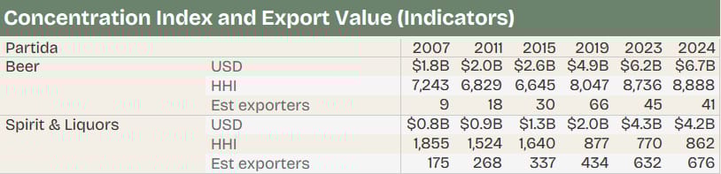 Export growth exploded regardless, growing faster and earlier than beer in relative terms — especially between 2013 and 2021, when fragmentation accelerated.