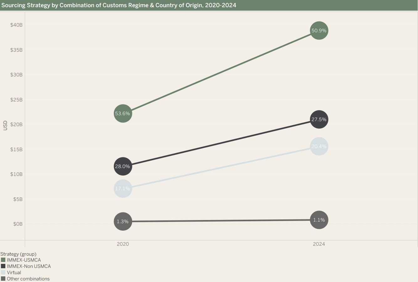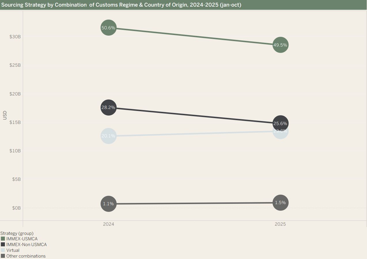 Looking at OEM import data by strategy (IMMEX–USMCA, IMMEX–Non USMCA, Virtual, Other) from 2020–2024, and then the more recent Jan–Oct 2024 vs Jan–Oct 2025 cut, you can actually see both phases: